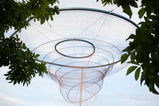Under the bright grey clouds of an early March evening, the net is a silhouette. People walk by the sculpture, some standing directly beneath it to look at it invertedly.
